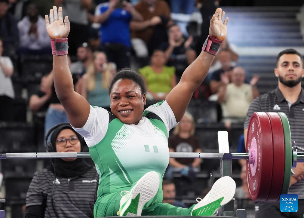 Onyinyechi Mark of Nigeria reacts during the para powerlifting women's up to 61kg final at the Paris 2024 Paralympic Games in Paris, France, Sept. 6, 2024. (Xinhua/Lian Yi)