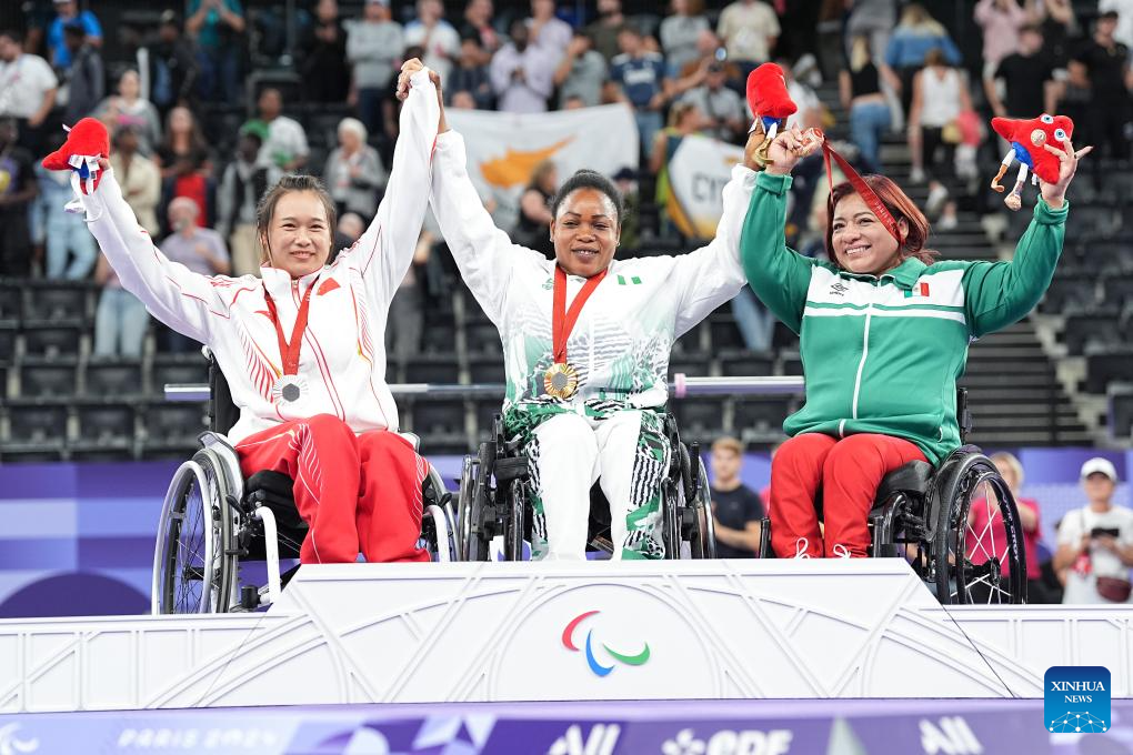 Gold medalist Onyinyechi Mark (C) of Nigeria, silver medalist Cui Jianjin (L) of China and bronze medalist Amalia Perez Vazquez of Mexico pose during the awarding ceremony for the para powerlifting women's up to 61kg event at the Paris 2024 Paralympic Games in Paris, France, Sept. 6, 2024. (Xinhua/Lian Yi)