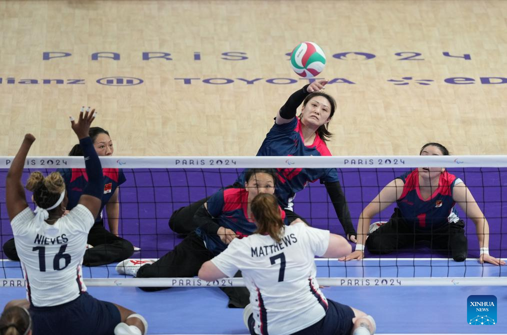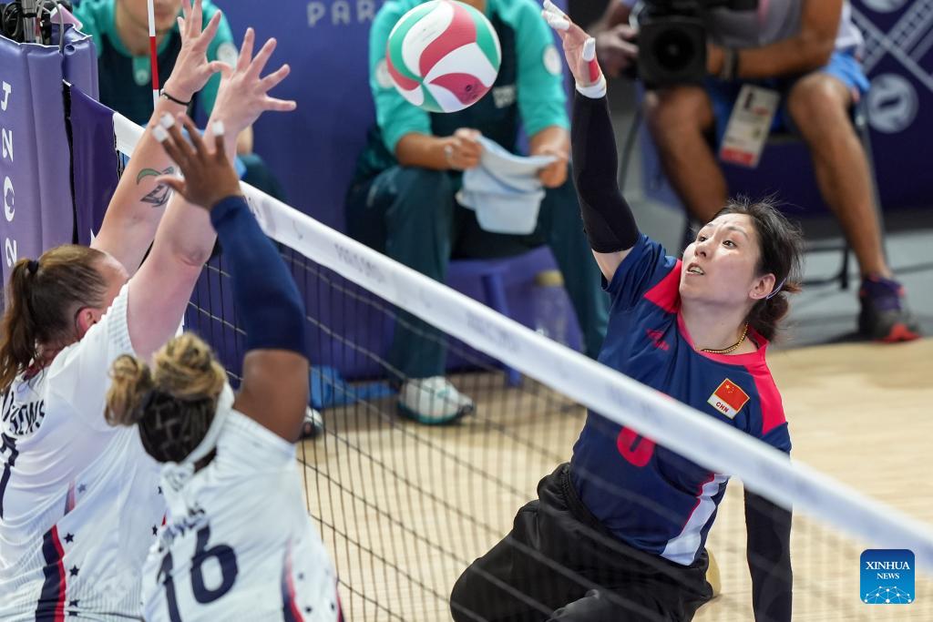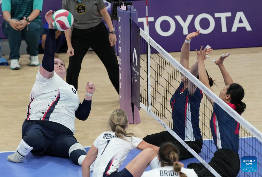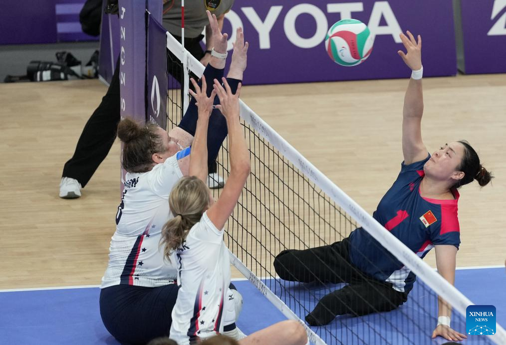 Heather Nicole Erickson (L) of the United States competes during the women's sitting volleyball final match between China and the United States at the Paris 2024 Paralympic Games in Paris, Sept. 7, 2024. (Xinhua/He Canling)