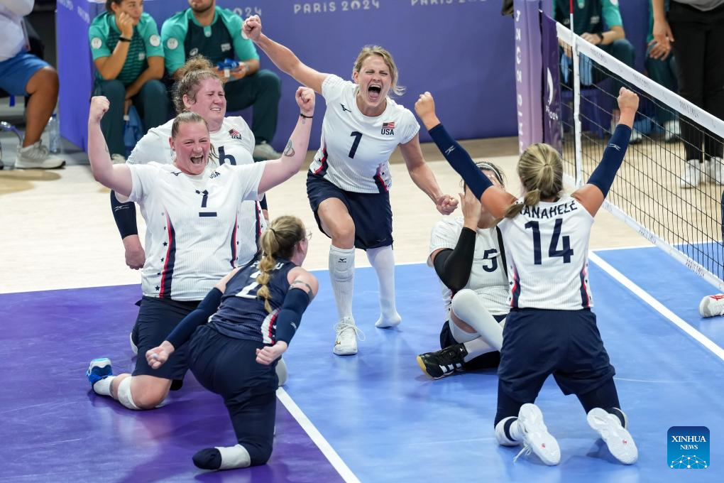 Players of the United States celebrate victory after the women's sitting volleyball final match between China and the United States at the Paris 2024 Paralympic Games in Paris, Sept.7, 2024. (Xinhua/Zhang Cheng)