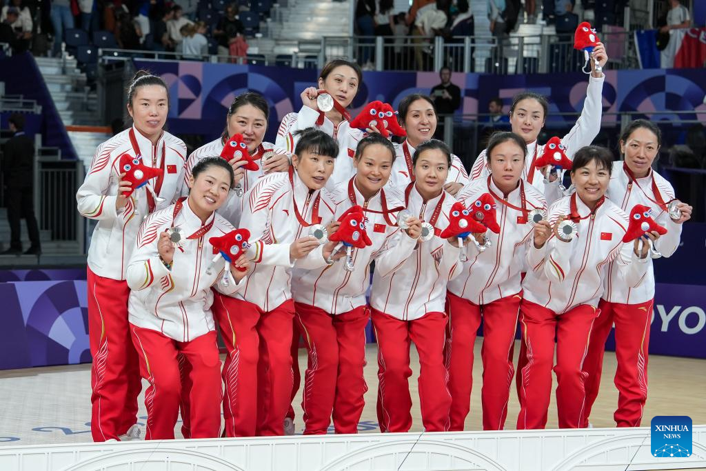 Players of China celebrate after the awarding ceremony for the women's sitting volleyball final match between China and the United States at the Paris 2024 Paralympic Games in Paris, Sept. 7, 2024. (Xinhua/Zhang Cheng)