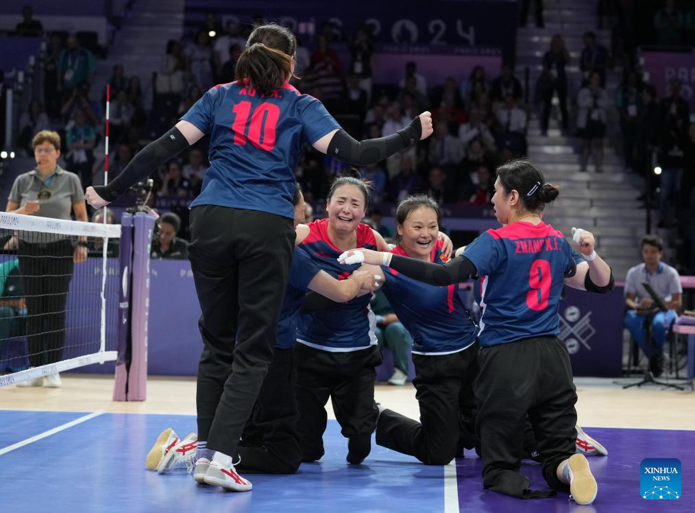 Players of China celebrate scoring during the women's sitting volleyball final match between China and the United States at the Paris 2024 Paralympic Games in Paris, Sept. 7, 2024. (Xinhua/He Canling)