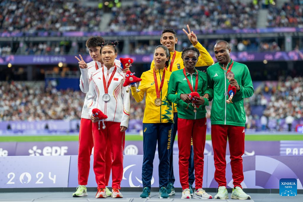 Gold medalists Jerusa Geber dos Santos (3rd L) and her guide Gabriel Aparecido dos Santos Garcia (3rd R) of Brazil, silver medalists Liu Cuiqing (2nd L) and her guide Chen Shengming (1st L) of China, bronze medalists Lahja Ishitile (2nd R) and her guide Sem Shimanda of Namibia pose during the awarding ceremony for the women's 200m T11 event of Para Athletics at the Paris 2024 Paralympic Games in Paris, France, Sept. 7, 2024. (Xinhua/Huang Wei)