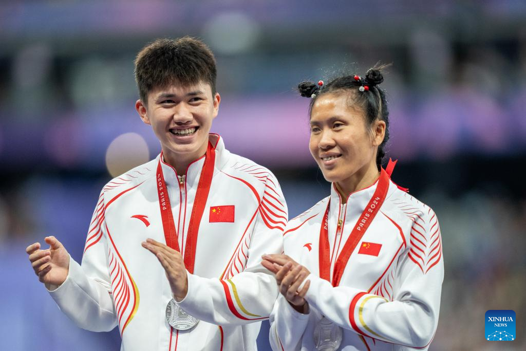 Silver medalists Liu Cuiqing (R) and her guide Chen Shengming of China react during the awarding ceremony for the women's 200m T11 event of Para Athletics at the Paris 2024 Paralympic Games in Paris, France, Sept. 7, 2024. (Xinhua/Huang Wei)
