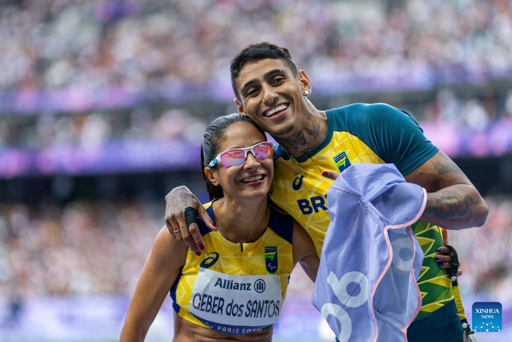Gold medalists Jerusa Geber dos Santos (L) and her guide Gabriel Aparecido dos Santos Garcia of Brazil celebrate after the women's 200m T11 event of Para Athletics at the Paris 2024 Paralympic Games in Paris, France, Sept. 7, 2024. (Xinhua/Huang Wei)