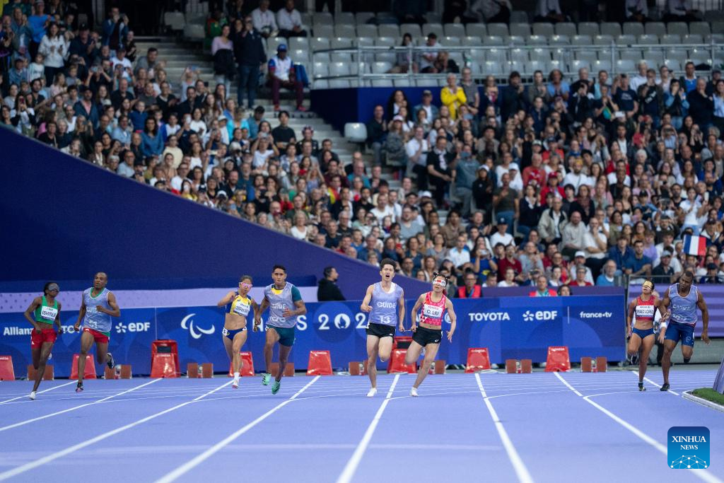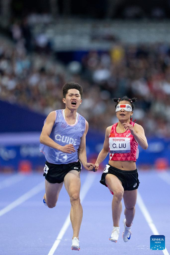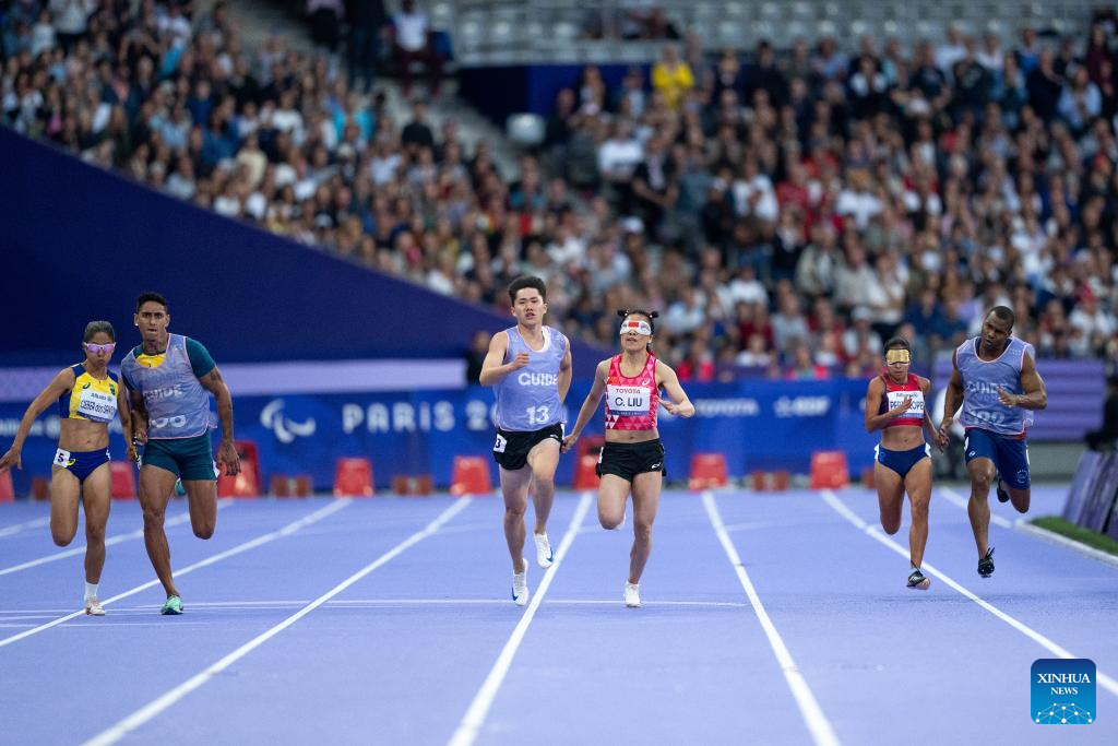 Liu Cuiqing (3rd R) and her guide Chen Shengming (3rd L) of China compete during the women's 200m T11 event of Para Athletics at the Paris 2024 Paralympic Games in Paris, France, Sept. 7, 2024. (Xinhua/Huang Wei)