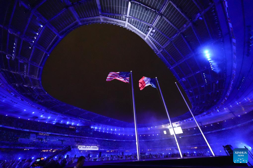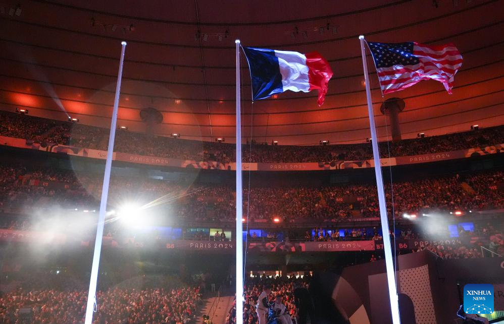 National flag of France and national flag of the United States are seen during the flag handover ceremony at the closing ceremony of the Paris 2024 Paralympic Games in Paris, France, Sept. 8, 2024. (Xinhua/Cai Yang)