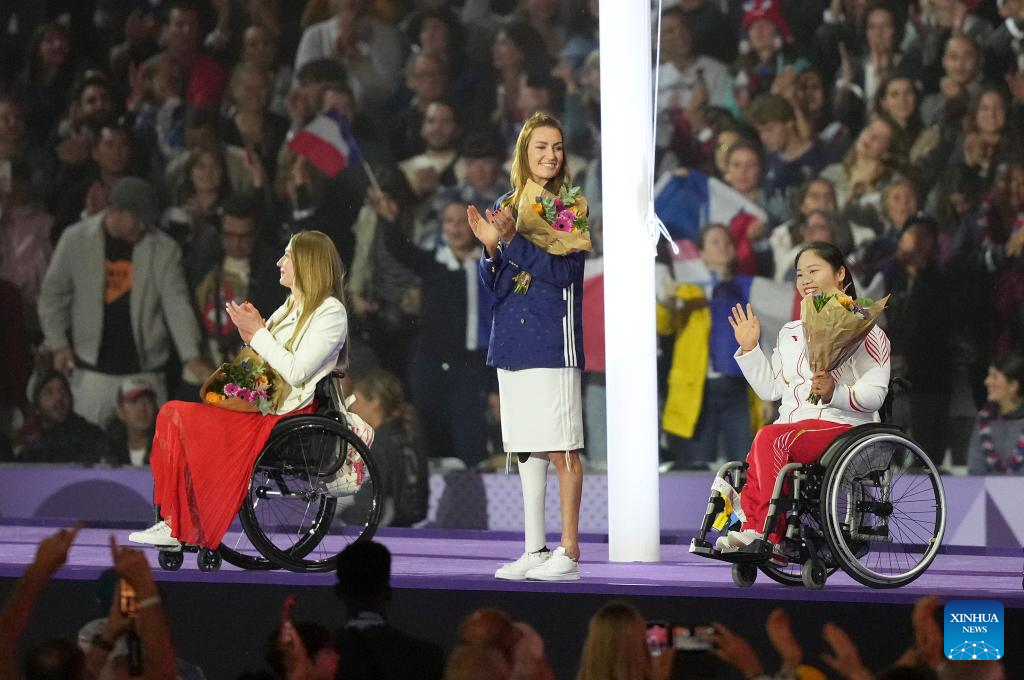 China's para-powerlifter Tan Yujiao (2nd R), member of the International Paralympic Committee (IPC) Athletes' Council, reacts during the closing ceremony of the Paris 2024 Paralympic Games in Paris, France, Sept. 8, 2024. (Xinhua/Zhang Cheng)