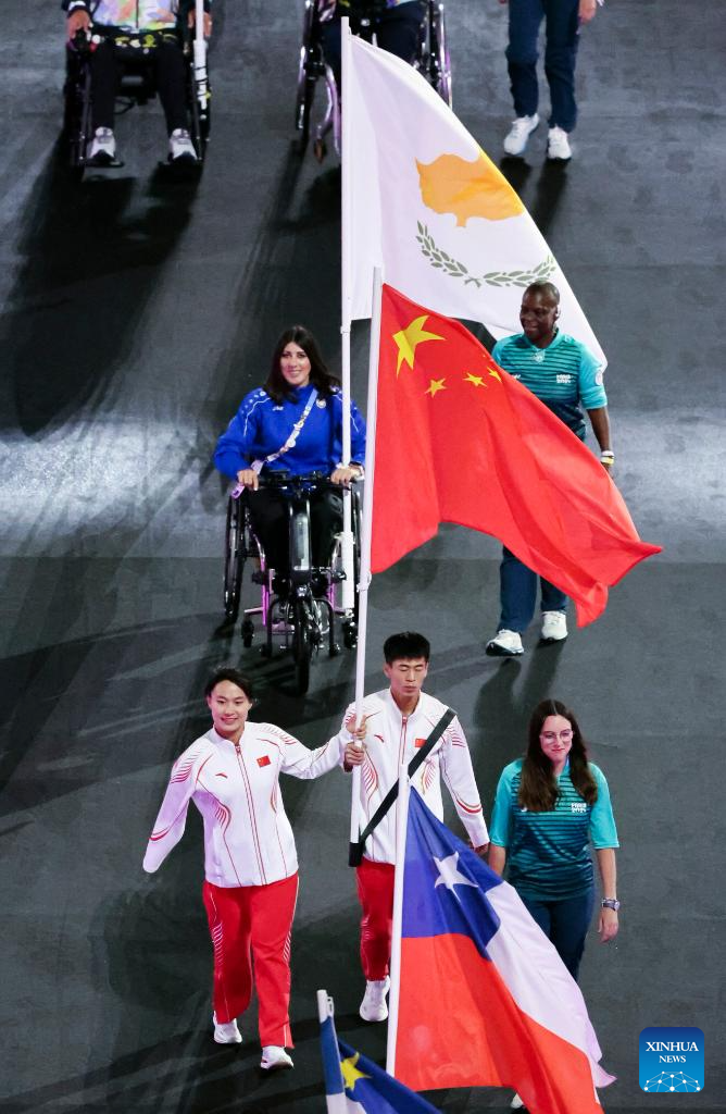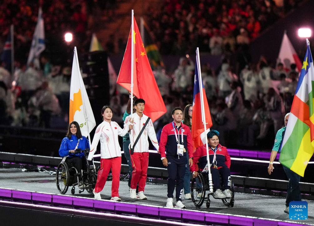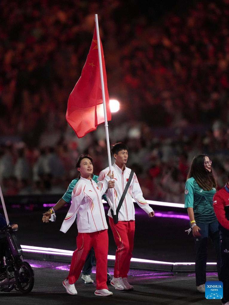 Flag-bearers of China Di Dongdong (front, C) and Jiang Yuyan (front, L) arrive for the closing ceremony of the Paris 2024 Paralympic Games in Paris, France, Sept. 8, 2024. (Xinhua/Hou Jun)