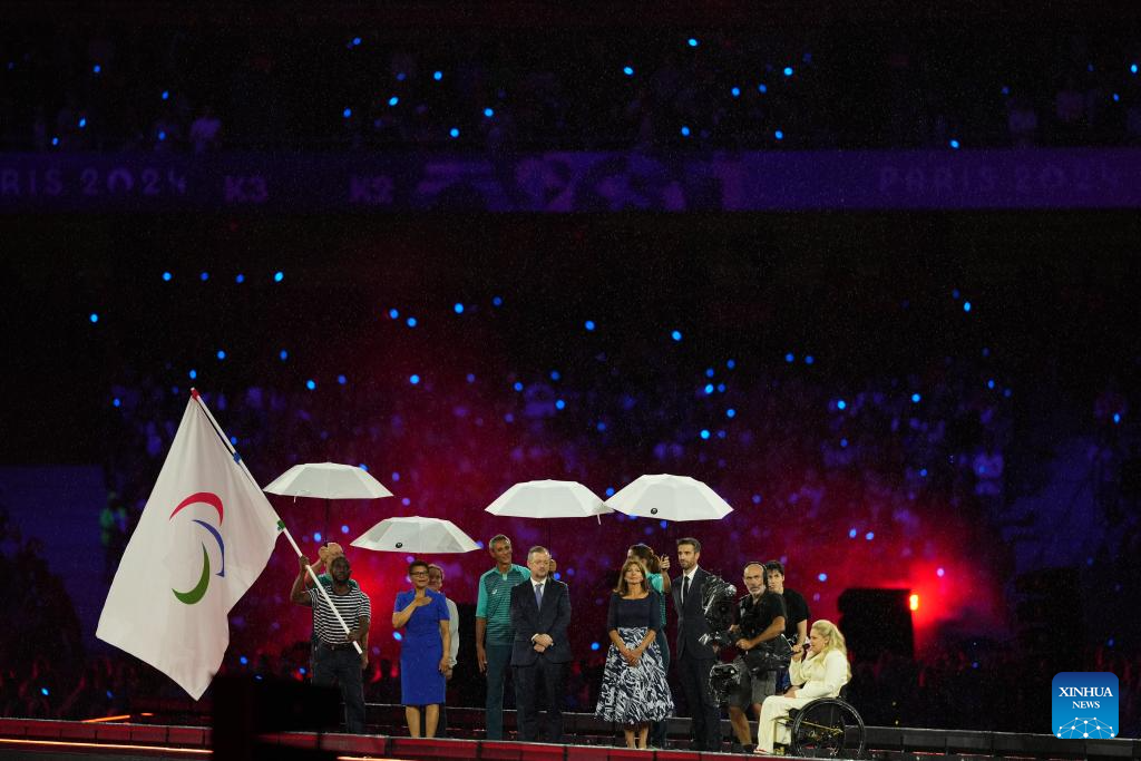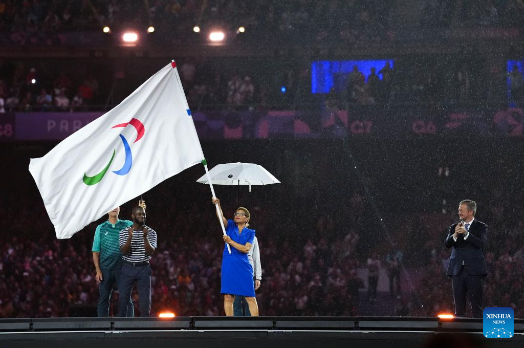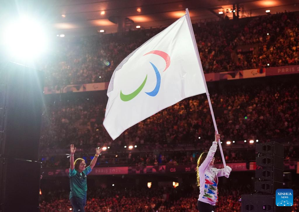 The Paralympic flag is seen during the closing ceremony of the Paris 2024 Paralympic Games in Paris, France, Sept. 8, 2024. (Xinhua/Cai Yang)