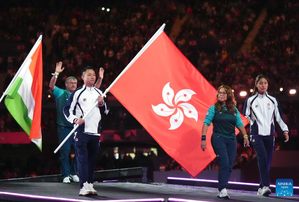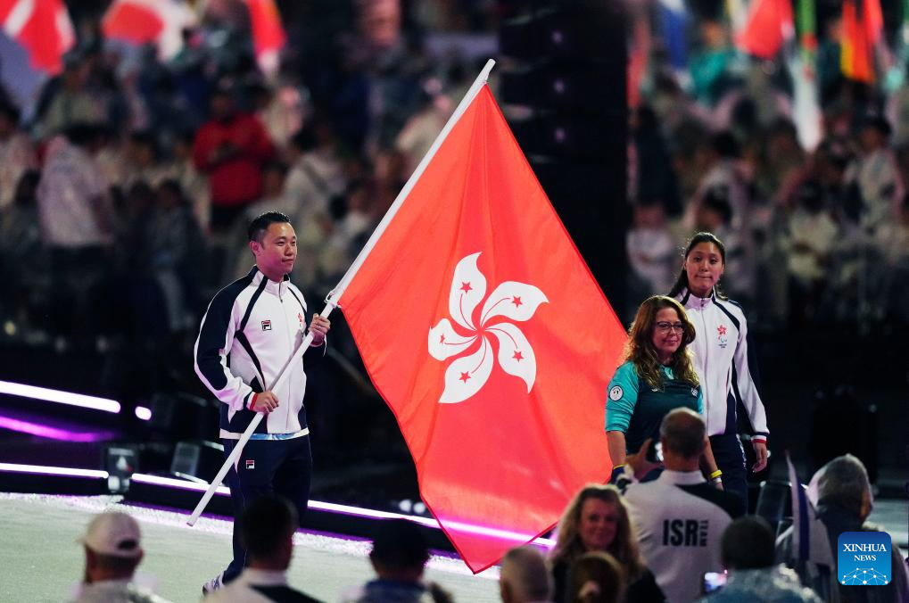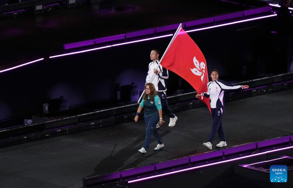 Flag-bearers of China's Hong Kong Chan Ho Yuen (top) and Chan Yui Lam (R) arrive for the closing ceremony of the Paris 2024 Paralympic Games in Paris, France, Sept. 8, 2024. (Xinhua/Gao Jing)