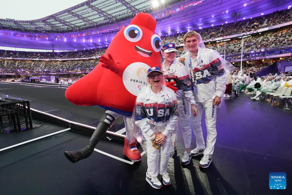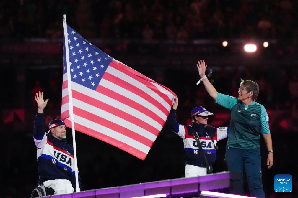 Flag-bearers of the United States Ellie Marks (C) and Paul Schulte (L) arrive for the closing ceremony of the Paris 2024 Paralympic Games in Paris, France, Sept. 8, 2024. (Xinhua/Cai Yang)