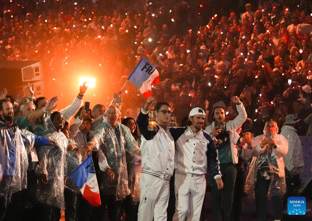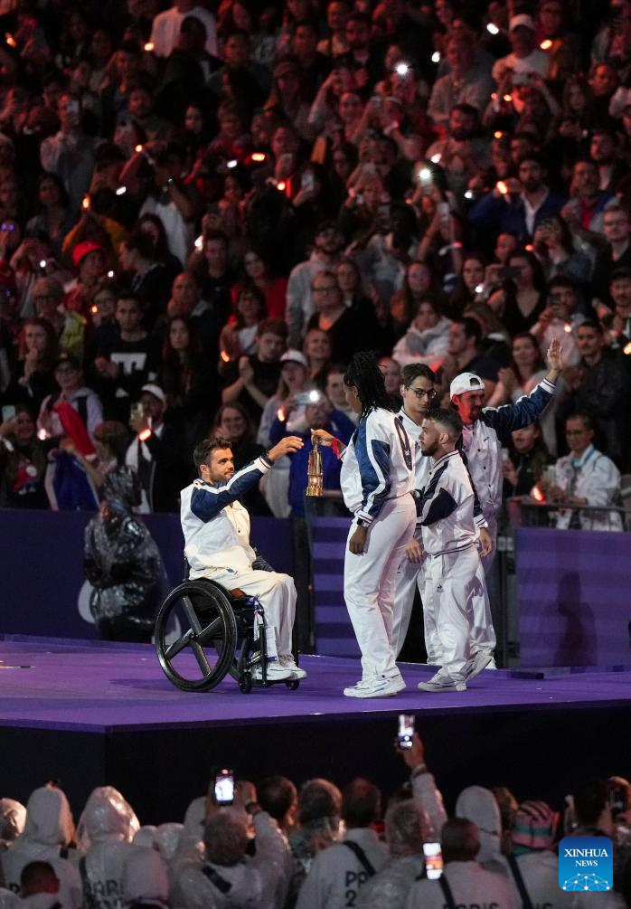 Gloria Agblemagnon of France (2nd L) gives the Paralympic flame to Mathieu Bosredon (1st L) of France during the closing ceremony of the Paris 2024 Paralympic Games in Paris, France, Sept. 8, 2024. (Xinhua/Zhang Cheng)