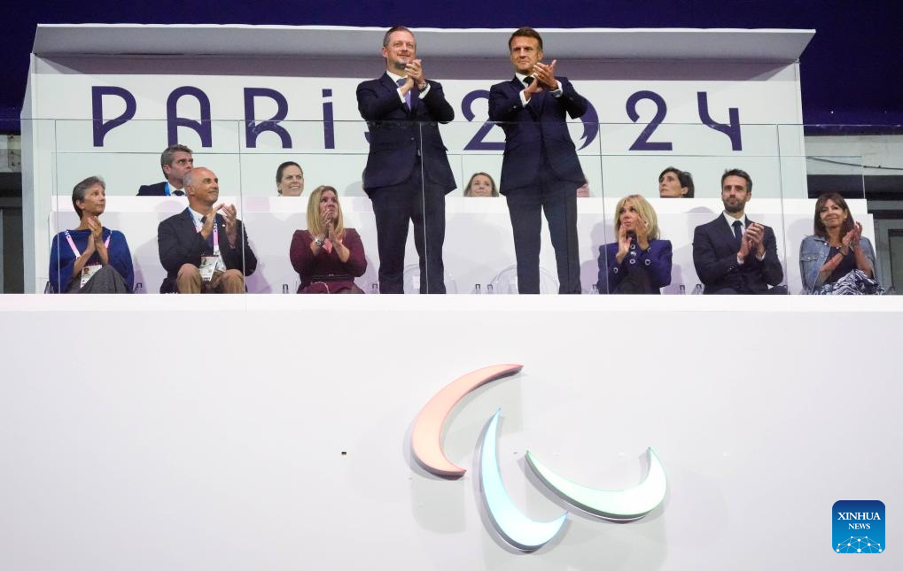 French President Emmanuel Macron (front, R) and IPC President Andrew Parsons (front, L) attends the closing ceremony of the Paris 2024 Paralympic Games in Paris, France, Sept. 8, 2024. (Xinhua/Cai Yang)
