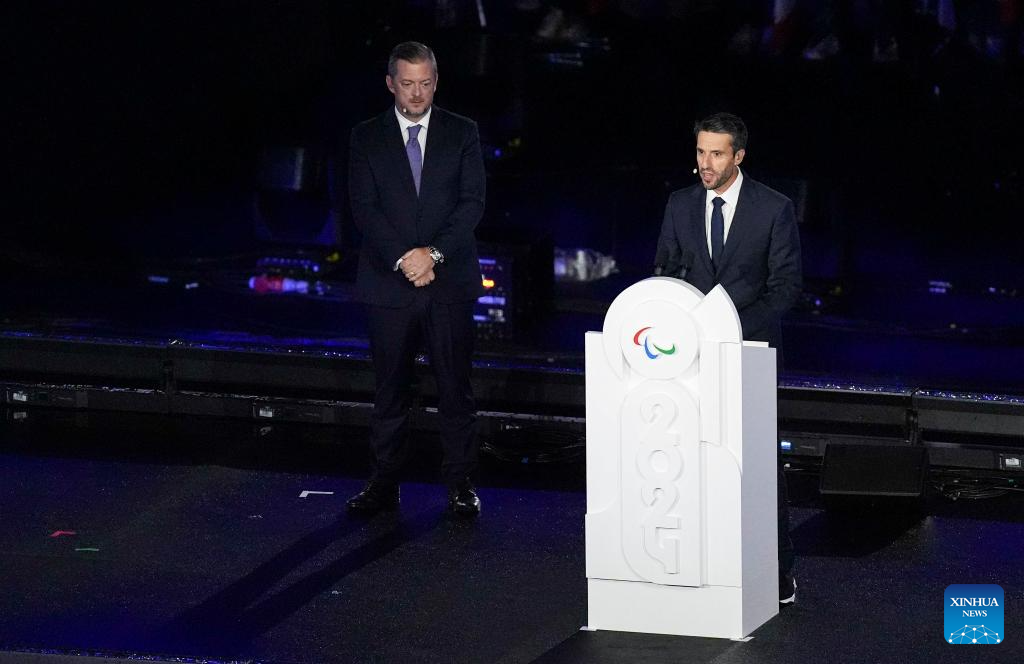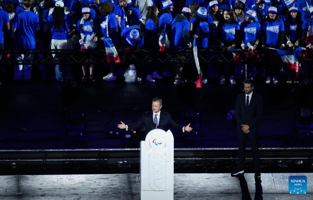 Tony Estanguet (R), president of the Paris 2024 Olympics and Paralympics Organizing Committee, delivers a speech during the closing ceremony of the Paris 2024 Paralympic Games in Paris, France, Sept. 8, 2024. (Xinhua/Xing Guangli)