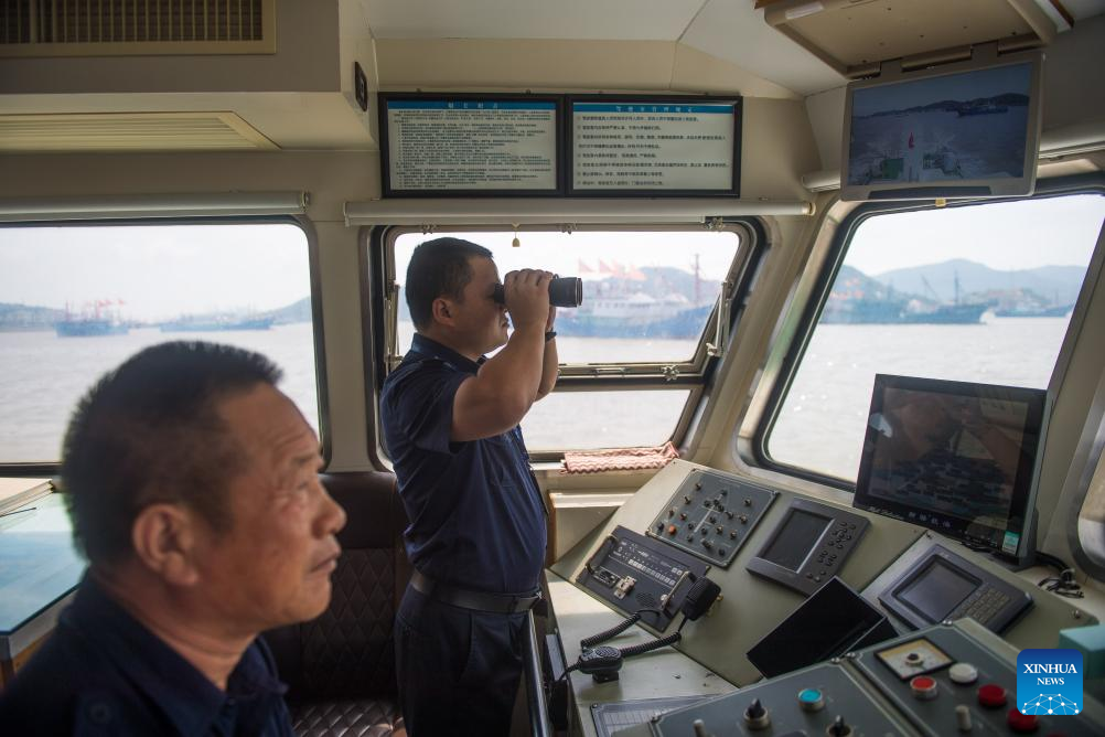 Marine bureau staff patrol at a fishing port in Xiangshan County, east China's Zhejiang Province, Sept. 15, 2024.