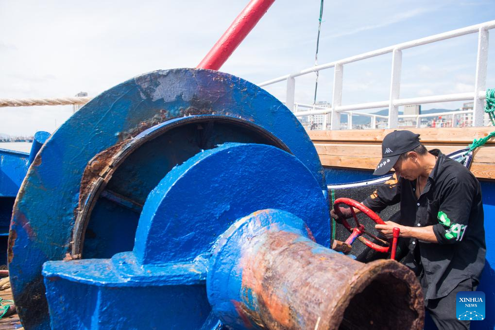 A fisherman checks a boat's anchor at a fishing port in Xiangshan County, east China's Zhejiang Province, Sept. 15, 2024. Eastern Chinese regions are recalling ships to port and monitoring risks of flash floods and geological disasters amid warnings of strong rain caused by the approaching Typhoon Bebinca. From Sunday night to Monday morning, Typhoon Bebinca will make landfall along the coast from Taizhou in Zhejiang to Qidong in Jiangsu, and cause tremendous rain, according to the Ministry of Emergency Management. (Xinhua/Jiang Han)