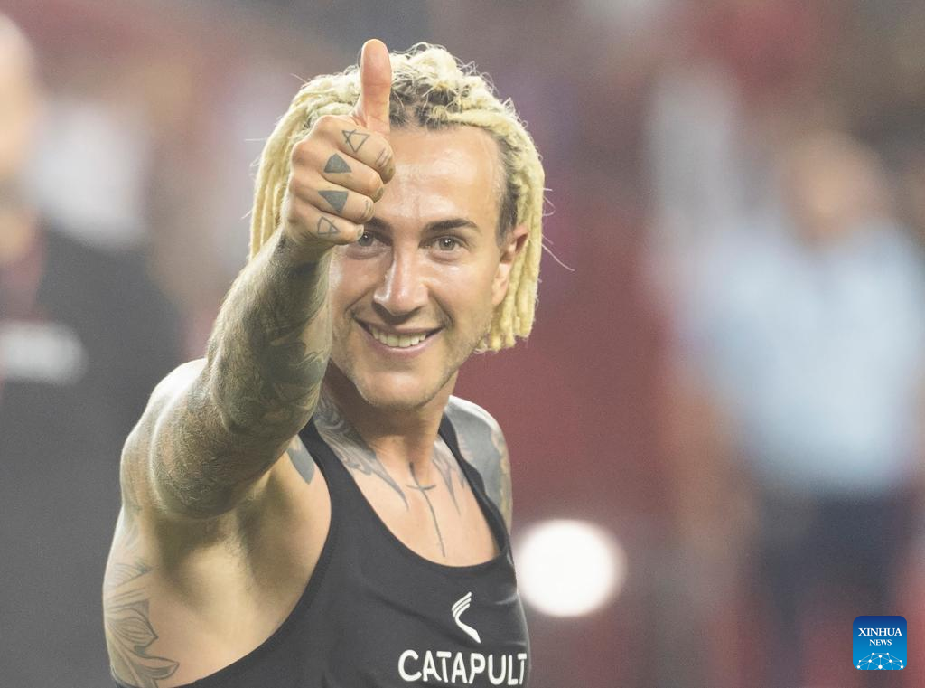 Federico Bernardeschi of Toronto FC celebrates victory after the 2024 Major League Soccer (MLS) match between Toronto FC and Austin FC at BMO Field in Toronto, Canada, Sept. 14, 2024. (Photo by Zou Zheng/Xinhua)