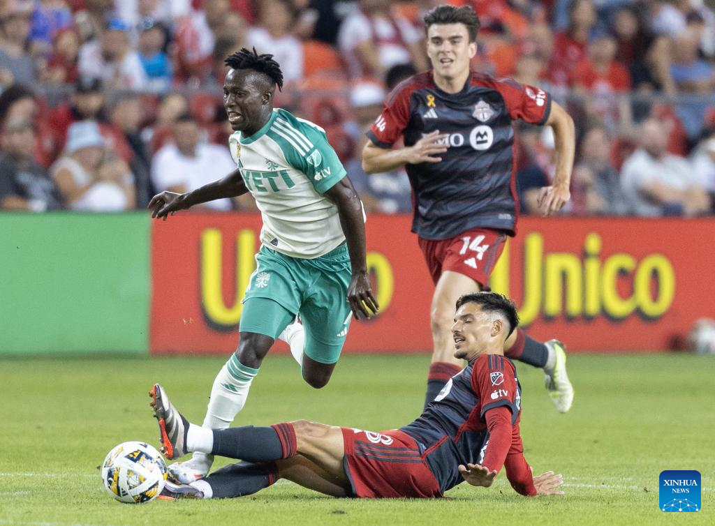 Raoul Petretta (Bottom) of Toronto FC vies with Osman Bukari (L) of Austin FC during the 2024 Major League Soccer (MLS) match in Toronto, Canada, Sept. 14, 2024. (Photo by Zou Zheng/Xinhua)