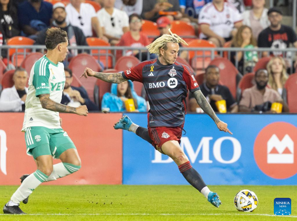 Federico Bernardeschi (R) of Toronto FC shoots the ball during the 2024 Major League Soccer (MLS) match between Toronto FC and Austin FC at BMO Field in Toronto, Canada, Sept. 14, 2024. (Photo by Zou Zheng/Xinhua)