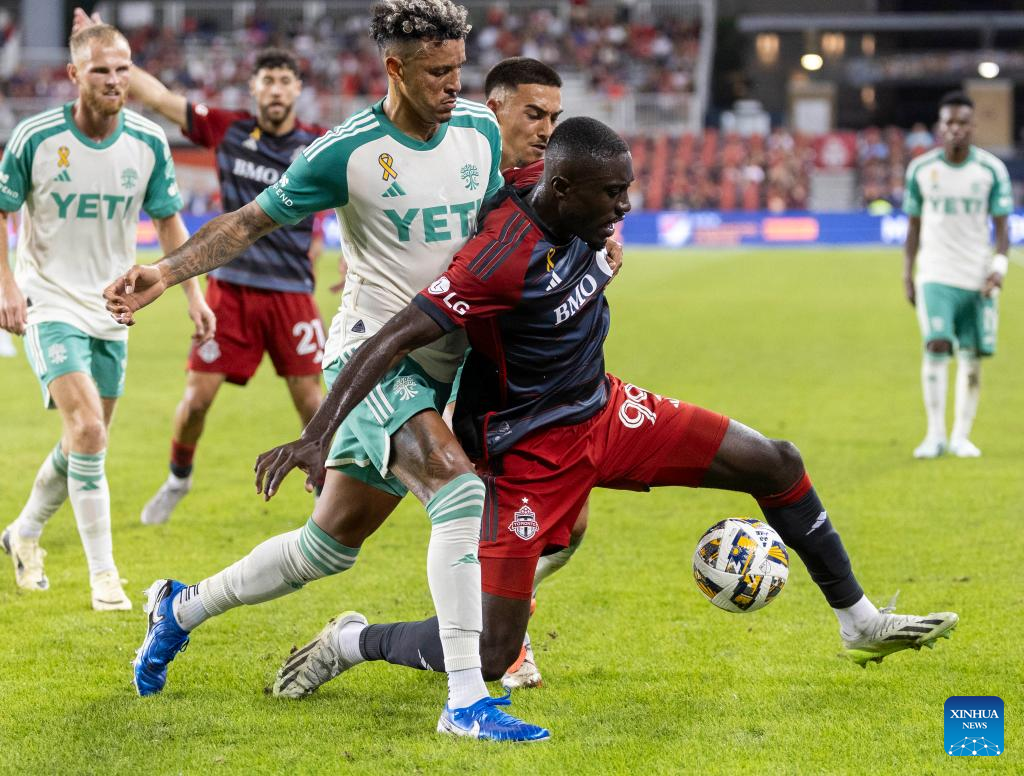 Henry Wingo (C) of Toronto FC vies with Jader Obrian of Austin FC during the 2024 Major League Soccer (MLS) match in Toronto, Canada, Sept. 14, 2024. (Photo by Zou Zheng/Xinhua)
