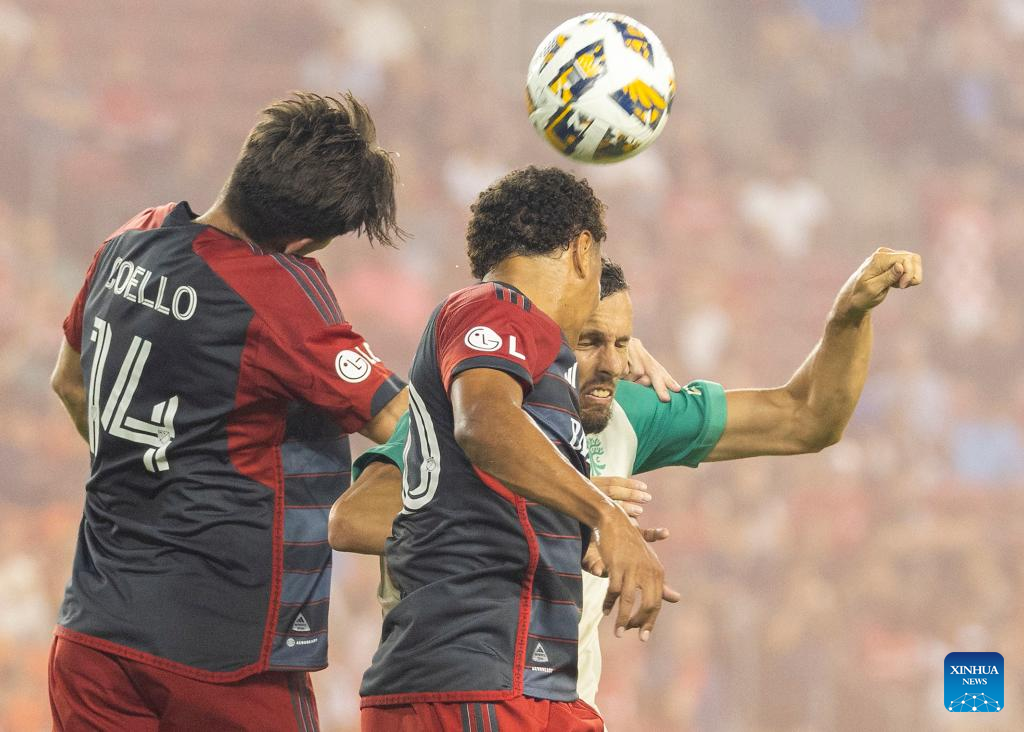 Henry Wingo (C) of Toronto FC fights for a header with Matt Hedges (R) of Austin FC during the 2024 Major League Soccer (MLS) match in Toronto, Canada, Sept. 14, 2024. (Photo by Zou Zheng/Xinhua)