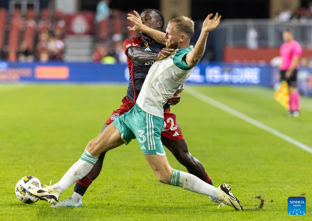 Richie Laryea (Back) of Toronto FC vies with Mikkel Desler of Austin FC during the 2024 Major League Soccer (MLS) match in Toronto, Canada, Sept. 14, 2024. (Photo by Zou Zheng/Xinhua)
