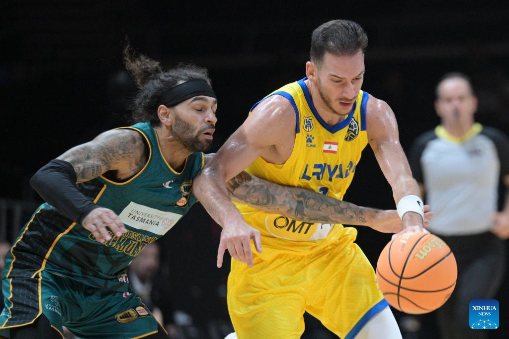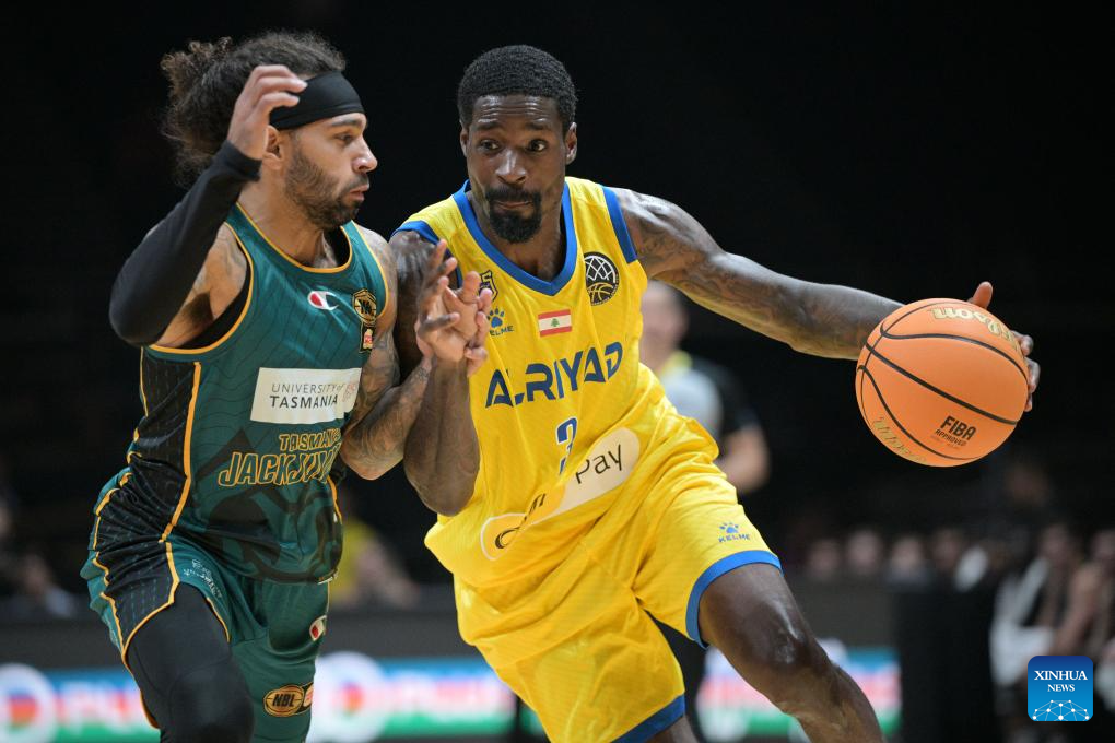 Jordon Crawford (L) of Tasmania JackJumpers defends against Karim Zeinoun of Al Riyadi Beirut during the bronze match between Tasmania JackJumpers of Australia and Al Riyadi Beirut of Lebanon at the FIBA Intercontinental Cup Singapore 2024 in Singapore, Sept. 15, 2024. (Photo by Then Chih Wey/Xinhua)