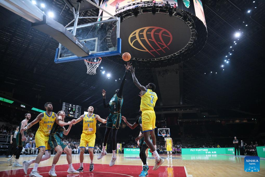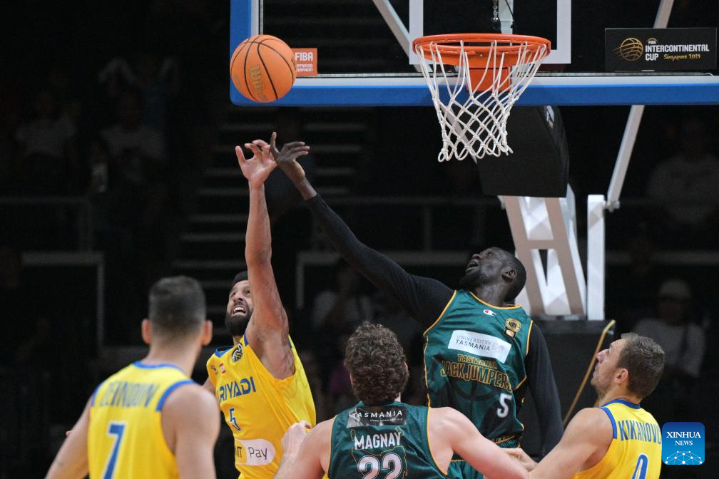 Majok Deng (2nd R) of Tasmania JackJumpers jumps for the rebound against Amir Saoud (2nd L) of Al Riyadi Beirut, during the bronze match between Tasmania JackJumpers of Australia and Al Riyadi Beirut of Lebanon at the FIBA Intercontinental Cup Singapore 2024 in Singapore, Sept. 15, 2024. (Photo by Then Chih Wey/Xinhua)