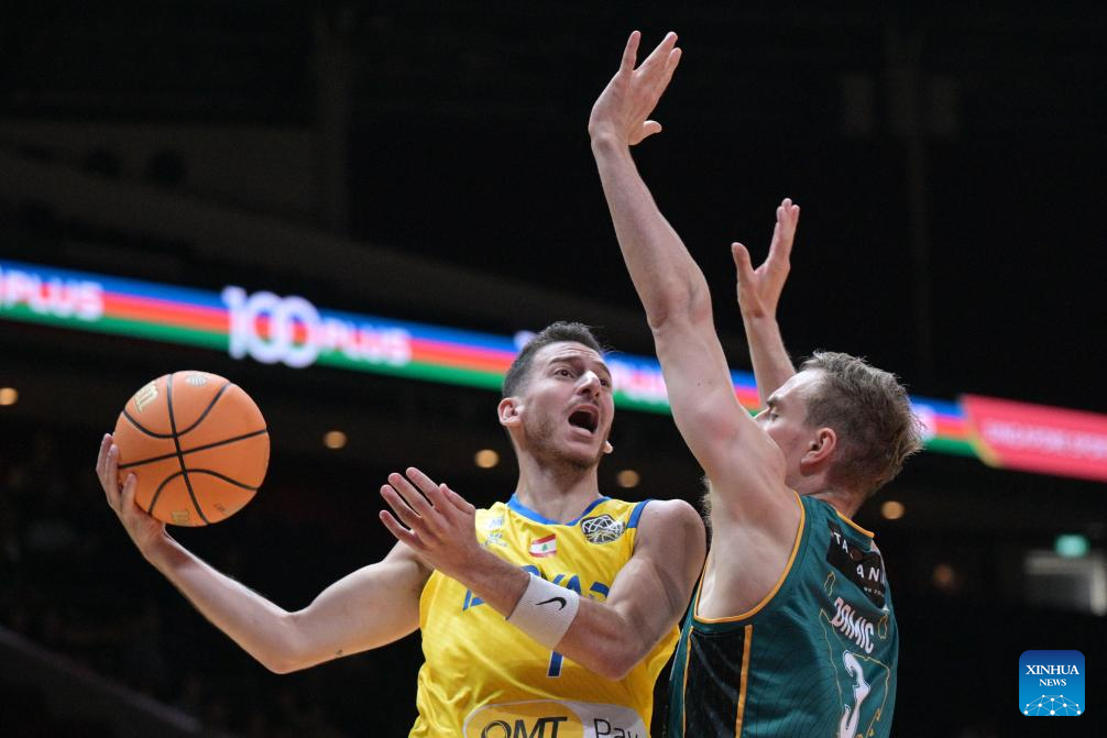 Anthony Drmic (R) of Tasmania JackJumpers defends against Karim Zeinoun of Al Riyadi Beirut during the bronze match between Tasmania JackJumpers of Australia and Al Riyadi Beirut of Lebanon at the FIBA Intercontinental Cup Singapore 2024 in Singapore, Sept. 15, 2024. (Photo by Then Chih Wey/Xinhua)