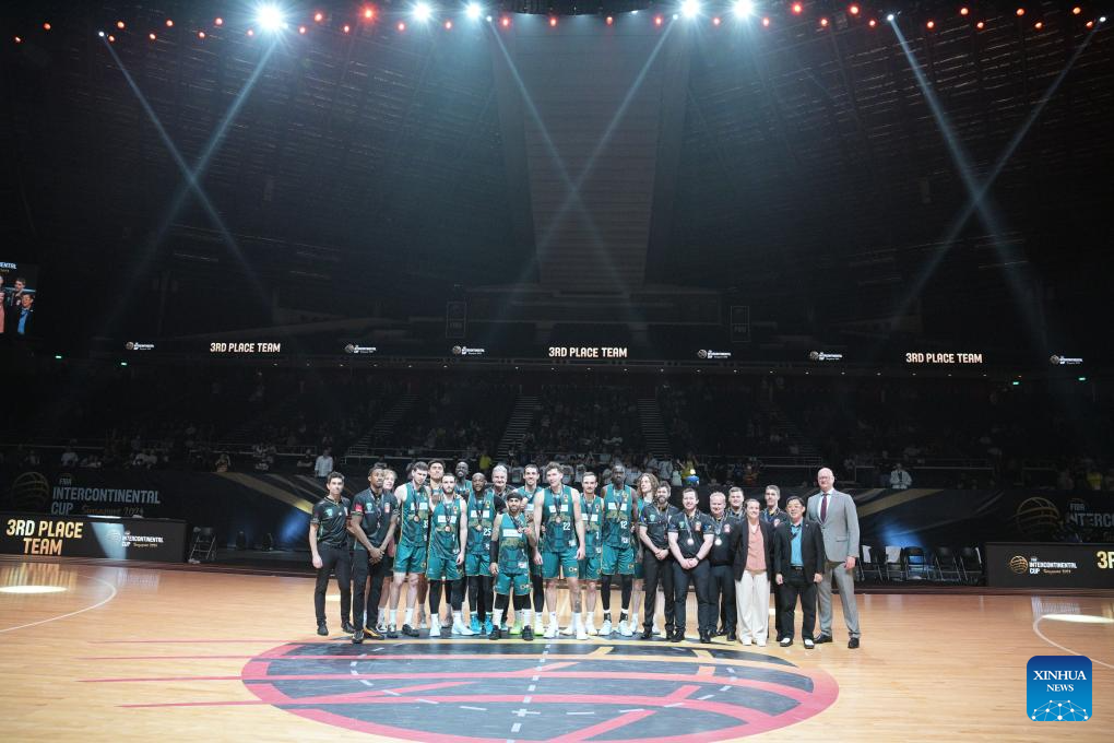Players and coaching staff of Tasmania JackJumpers gather for a group photo during the awarding ceremony of the bronze match between Tasmania JackJumpers of Australia and Al Riyadi Beirut of Lebanon at the FIBA Intercontinental Cup Singapore 2024 in Singapore, Sept. 15, 2024. (Photo by Then Chih Wey/Xinhua)