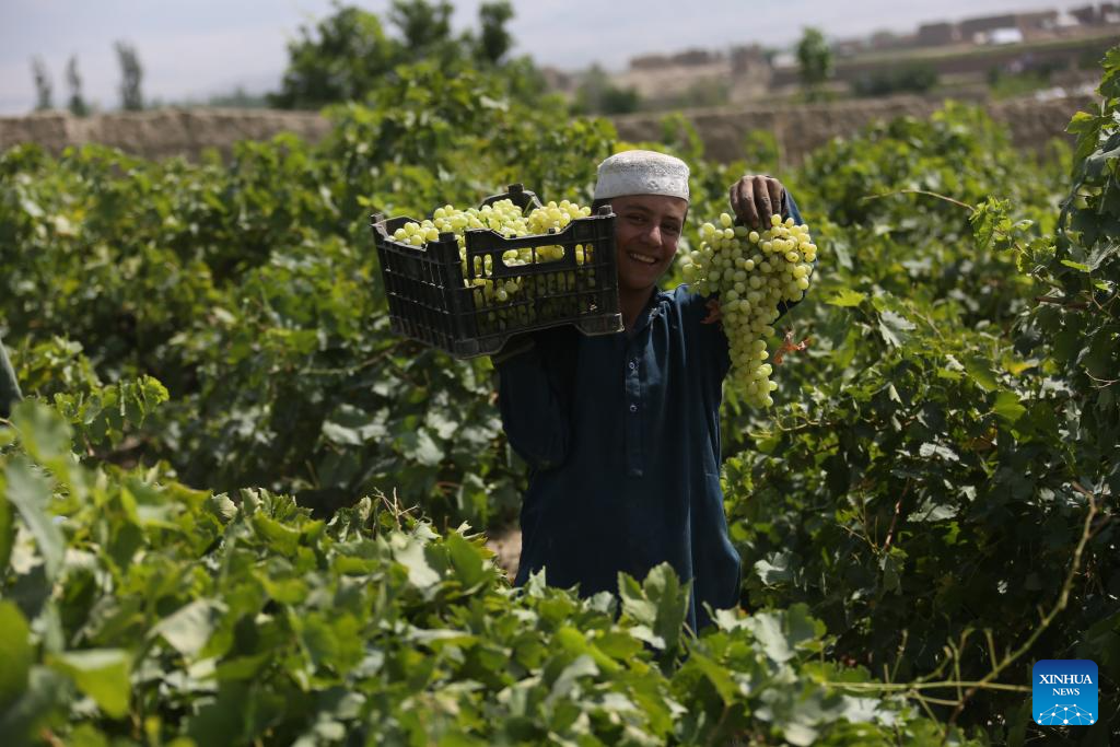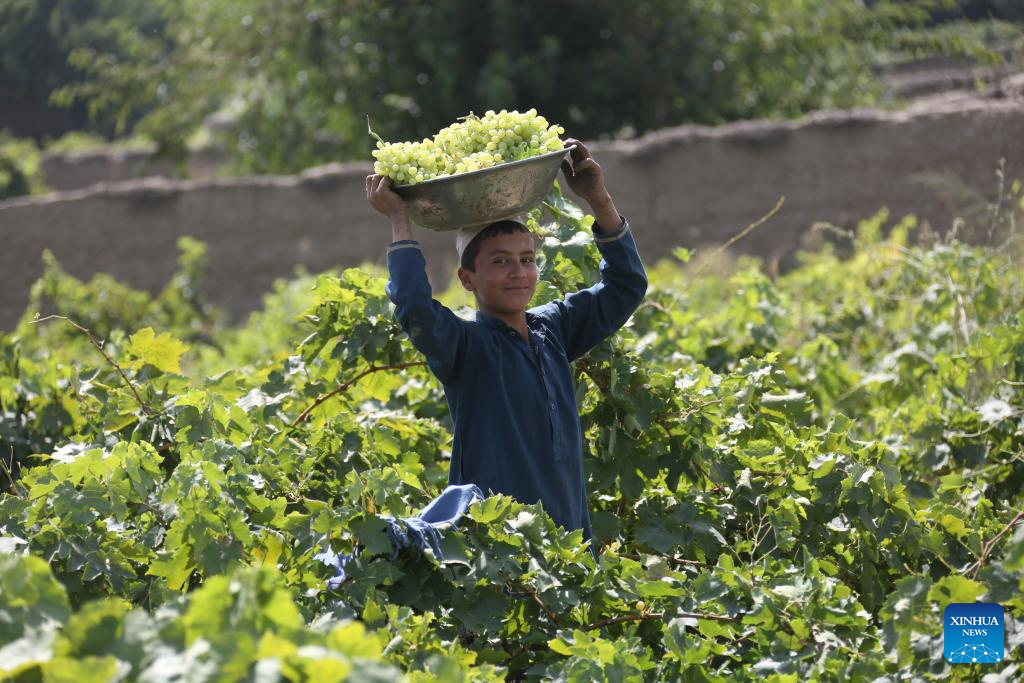 An Afghan farmer carries harvested grapes at a vineyard in Parwan province, Afghanistan, Sept. 15, 2024. (Photo by Saifurahman Safi/Xinhua)