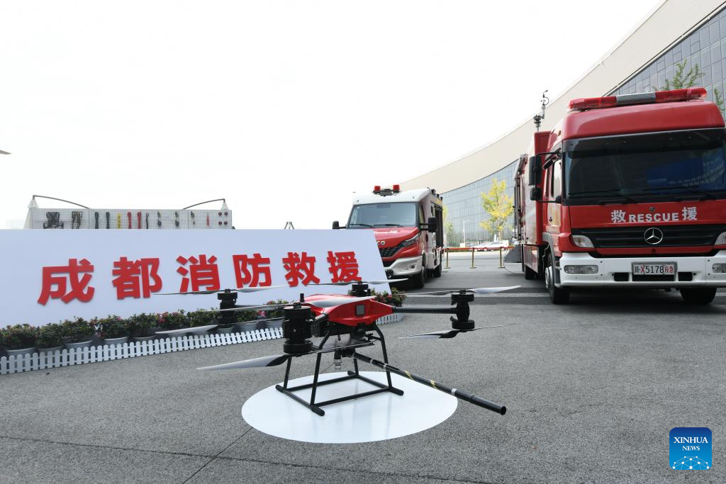 This photo taken on Sept. 20, 2024 shows firefighting and rescue equipment displayed at the 2024 Chengdu International Low-altitude Equipment and Services Expo in Chengdu, southwest China's Sichuan Province. The 2024 China (Chengdu) International Low-altitude Economic Partnership Conference & 2024 Chengdu International Low-altitude Equipment and Services Expo is held here from Sept. 19 to 21, showcasing cutting-edge technologies and new products in low-altitude economy. (Xinhua/Tang Wenhao)