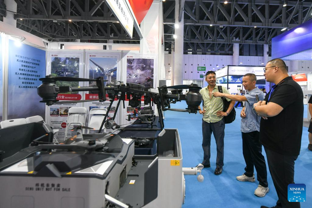 Visitors look at unmanned aerial vehicle (UAV) products at the 2024 Chengdu International Low-altitude Equipment and Services Expo in Chengdu, southwest China's Sichuan Province, Sept. 20, 2024. The 2024 China (Chengdu) International Low-altitude Economic Partnership Conference & 2024 Chengdu International Low-altitude Equipment and Services Expo is held here from Sept. 19 to 21, showcasing cutting-edge technologies and new products in low-altitude economy. (Xinhua/Tang Wenhao)