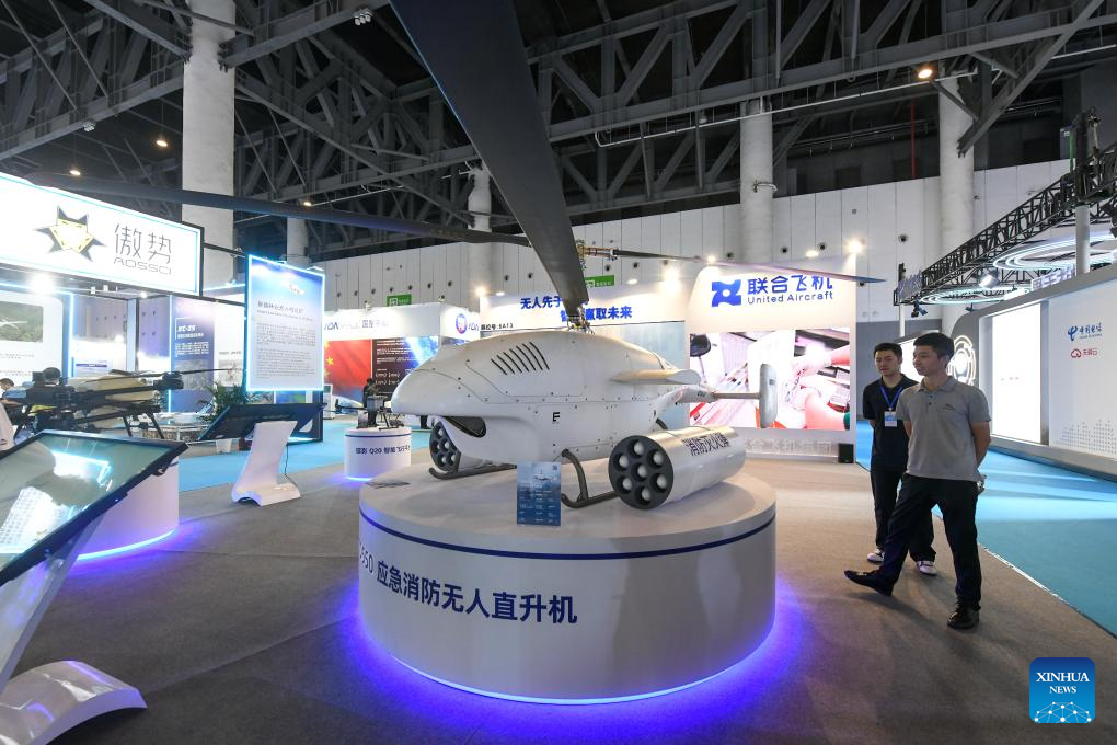 Visitors view an unmanned helicopter for emergency and firefighting operation displayed at the 2024 Chengdu International Low-altitude Equipment and Services Expo in Chengdu, southwest China's Sichuan Province, Sept. 20, 2024. The 2024 China (Chengdu) International Low-altitude Economic Partnership Conference & 2024 Chengdu International Low-altitude Equipment and Services Expo is held here from Sept. 19 to 21, showcasing cutting-edge technologies and new products in low-altitude economy. (Xinhua/Tang Wenhao)