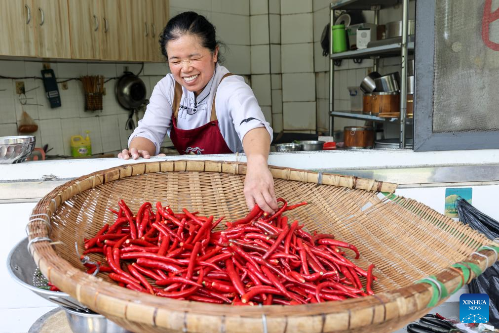 A villager select peppers at a homestay near the Daxiaojing grand bridge in southwest China's Guizhou Province, Sept. 5, 2024. In recent years, Guizhou Province has strived to upgrade its transportation system with an eye toward modernity and connectivity. Currently, more than 30,000 bridges have been built or are under construction in the province.