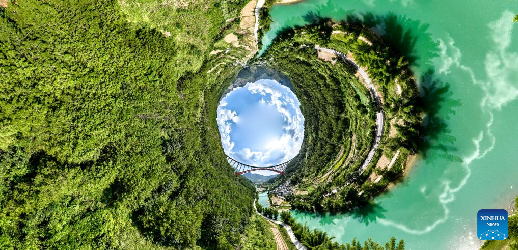 An aerial drone photo shows a bamboo raft carrying tourists at a scenic spot near the Daxiaojing grand bridge in southwest China's Guizhou Province, Sept. 5, 2024. In recent years, Guizhou Province has strived to upgrade its transportation system with an eye toward modernity and connectivity. Currently, more than 30,000 bridges have been built or are under construction in the province.