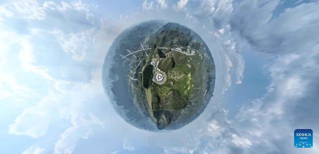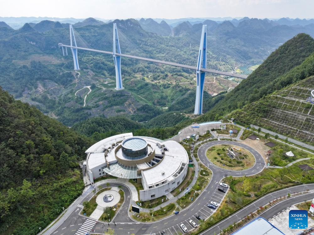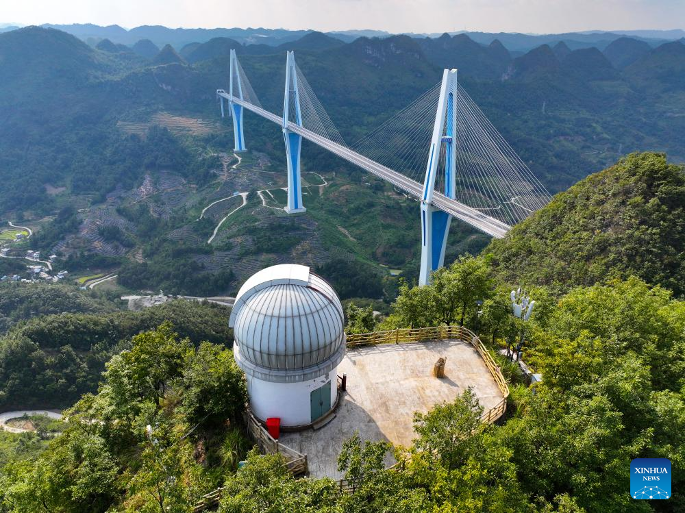 A drone photo shows an astronomic telescope at the "Sky Bridge" sightseeing service area in Pingtang County, southwest China's Guizhou Province, Sept. 5, 2024. In recent years, Guizhou Province has strived to upgrade its transportation system with an eye toward modernity and connectivity. Currently, more than 30,000 bridges have been built or are under construction in the province.