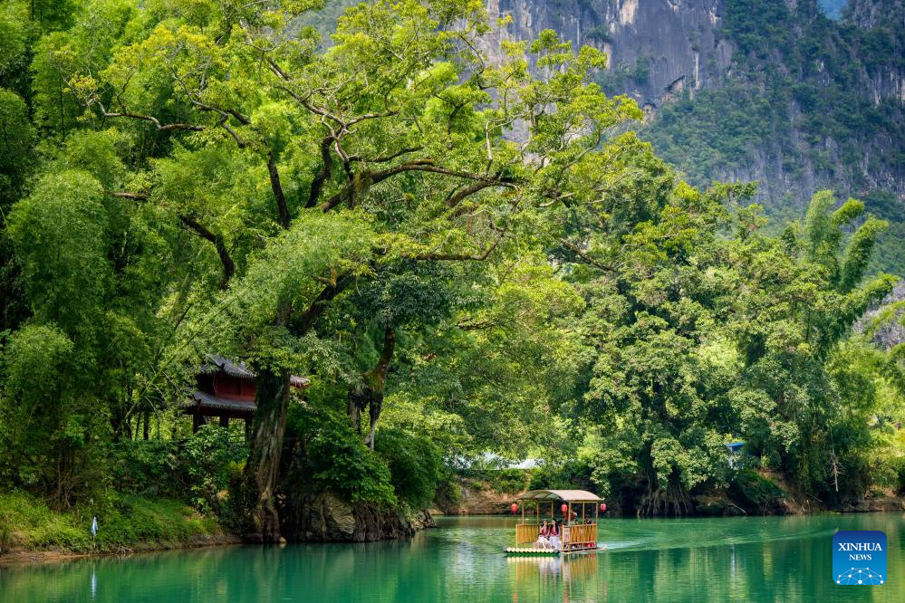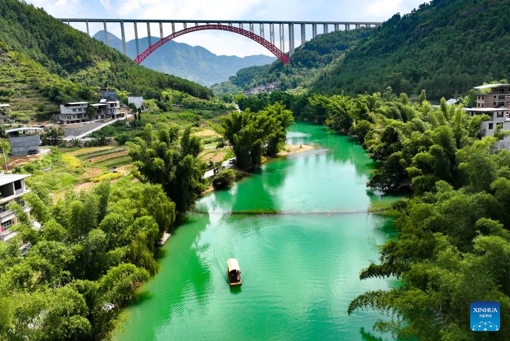 A drone photo shows a bamboo raft carrying tourists at a scenic spot near the Daxiaojing grand bridge in southwest China's Guizhou Province, Sept. 5, 2024. In recent years, Guizhou Province has strived to upgrade its transportation system with an eye toward modernity and connectivity. Currently, more than 30,000 bridges have been built or are under construction in the province.