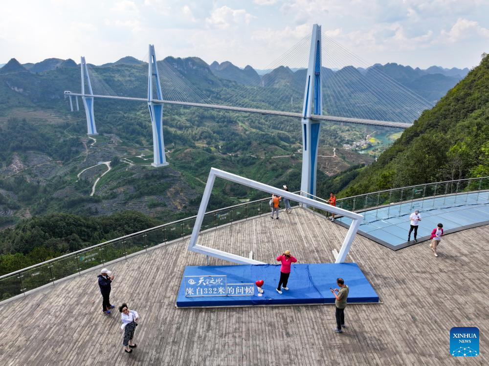 Visitors have fun at a scenic spot near the Daxiaojing grand bridge in southwest China's Guizhou Province, Sept. 5, 2024. In recent years, Guizhou Province has strived to upgrade its transportation system with an eye toward modernity and connectivity. Currently, more than 30,000 bridges have been built or are under construction in the province.