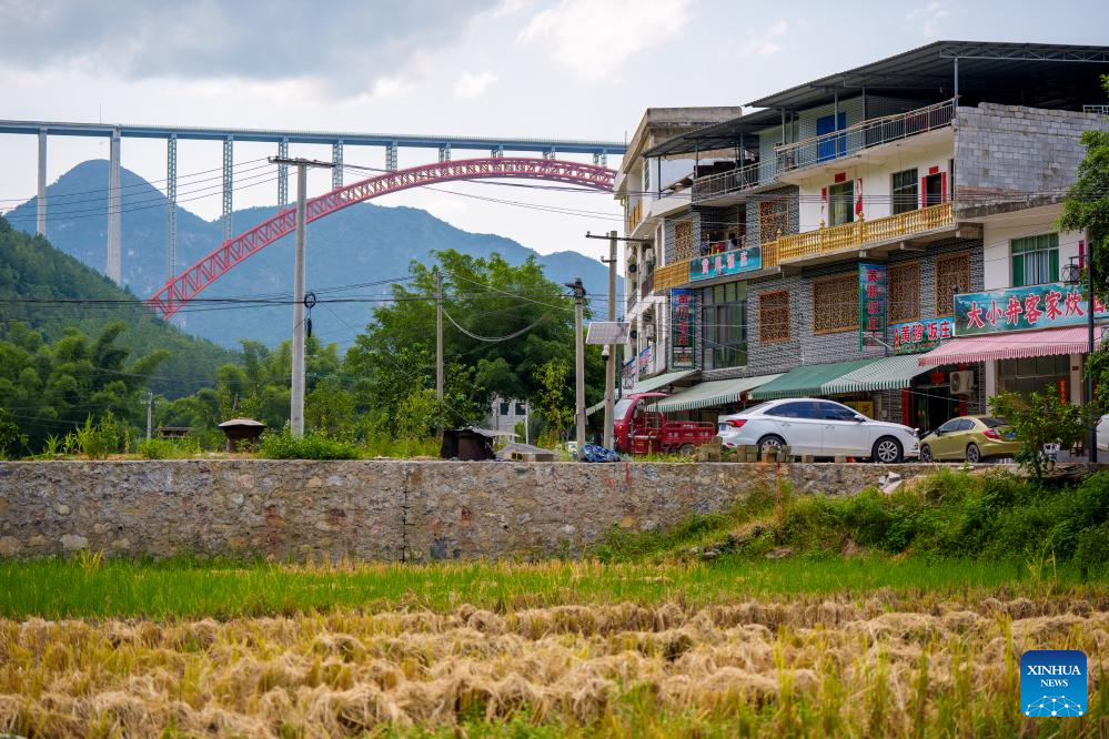 This photo shows a homestay near the Daxiaojing grand bridge in southwest China's Guizhou Province, Sept. 5, 2024. In recent years, Guizhou Province has strived to upgrade its transportation system with an eye toward modernity and connectivity. Currently, more than 30,000 bridges have been built or are under construction in the province.