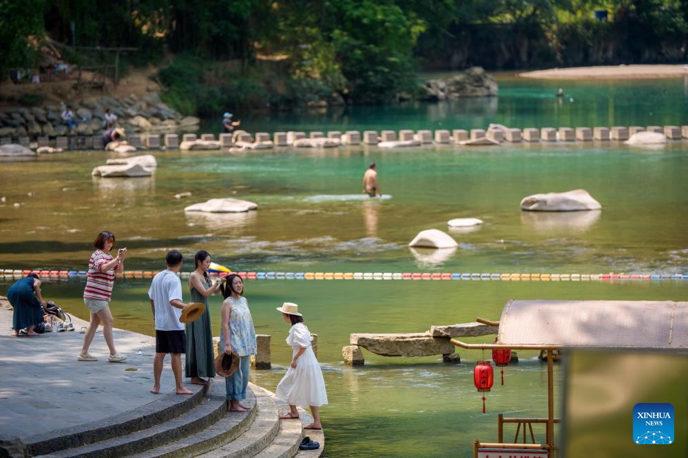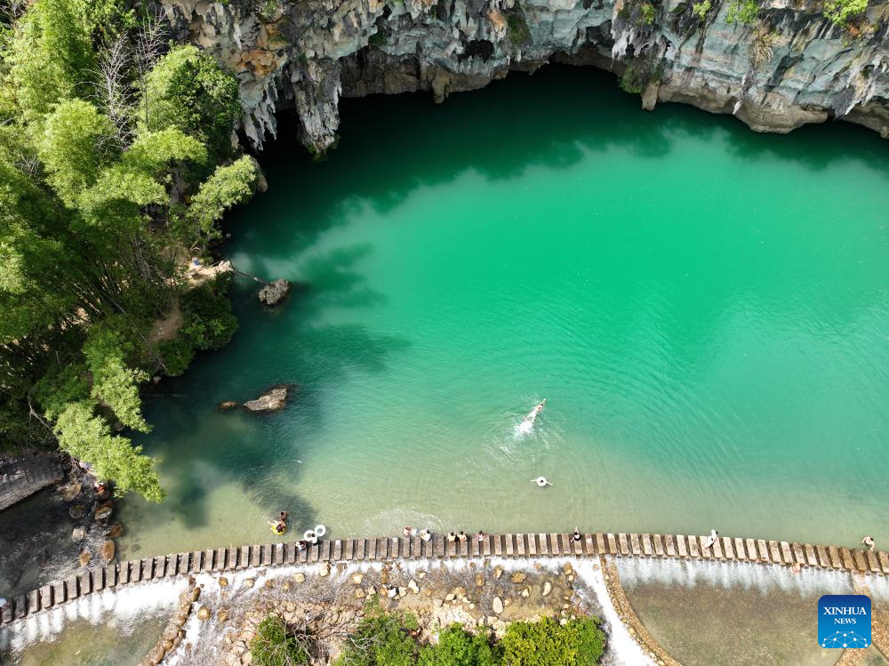 An aerial drone photo shows people visiting Daxiaojing scenic spot in Luodian County, southwest China's Guizhou Province, Sept. 5, 2024. In recent years, Guizhou Province has strived to upgrade its transportation system with an eye toward modernity and connectivity. Currently, more than 30,000 bridges have been built or are under construction in the province.