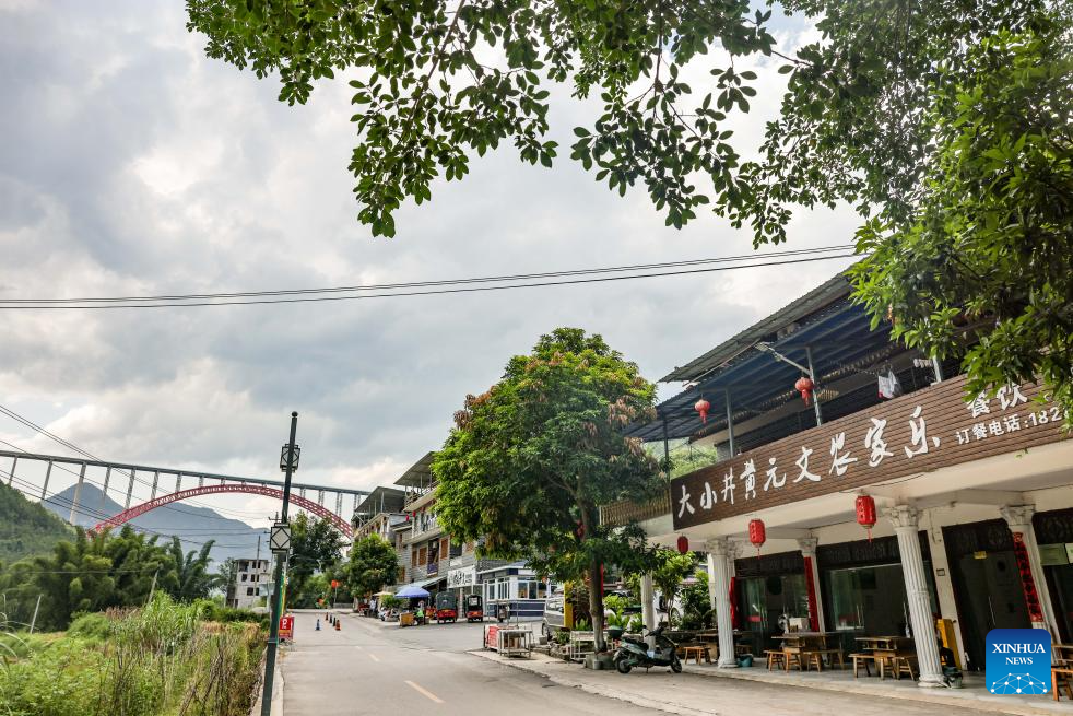 This photo shows restaurants and homestay at a scenic spot near the Daxiaojing grand bridge in southwest China's Guizhou Province, Sept. 5, 2024. In recent years, Guizhou Province has strived to upgrade its transportation system with an eye toward modernity and connectivity. Currently, more than 30,000 bridges have been built or are under construction in the province.