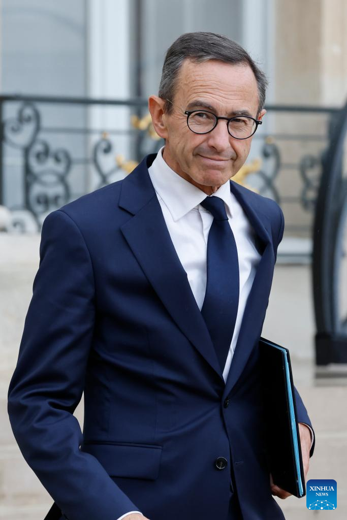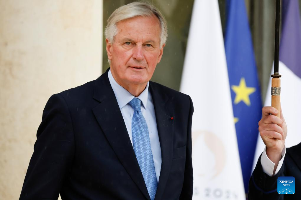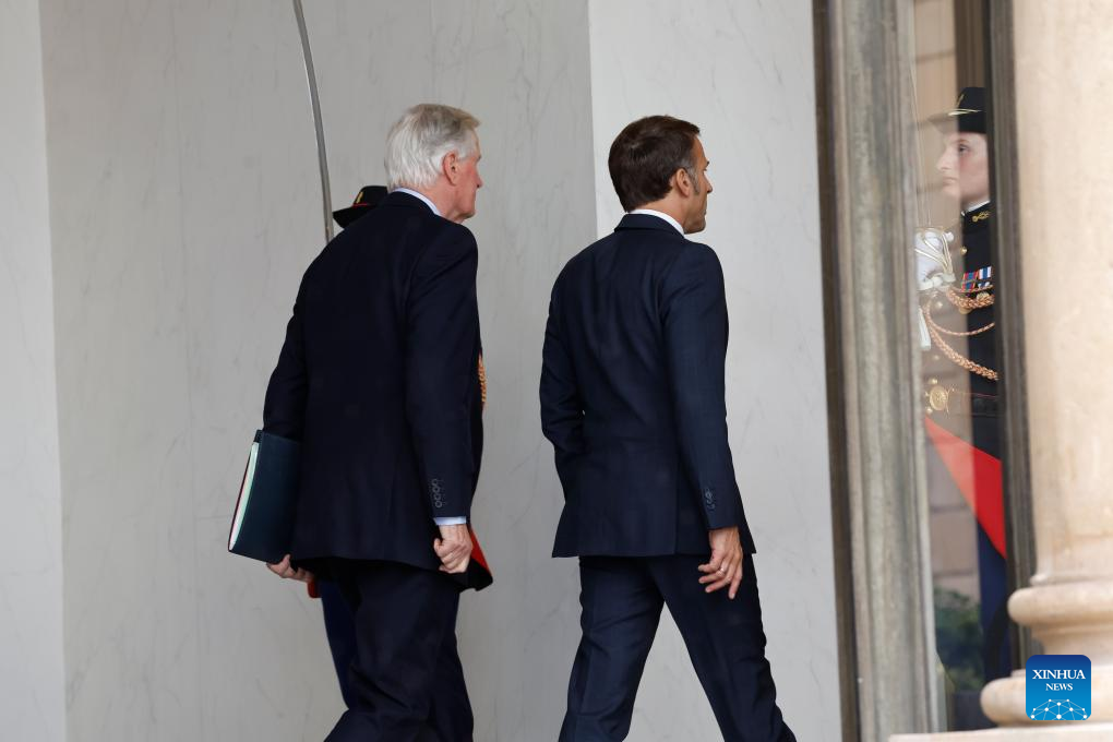 French Prime Minister Michel Barnier leaves after the first cabinet meeting of the new government at the Elysee Palace in Paris, France, Sept. 23, 2024. French Prime Minister Michel Barnier announced on Sept. 21 the formation of his government with 39 members coming from center and right-wing parties. Among the 17 ministers, seven come from President Emmanuel Macron's centrist alliance and three from Barnier's conservative party The Republicans (Les Republicains). (Photo by Henri Szwarc/Xinhua)