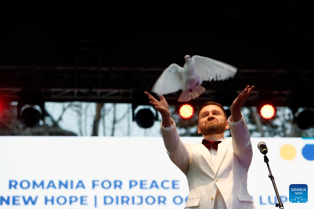 Octavian Lup, conductor of the New Hope Orchestra, releases a white pigeon before the "Romania for Peace" open air concert on the International Day of Peace in Bucharest, Romania, Sept. 21, 2024.
