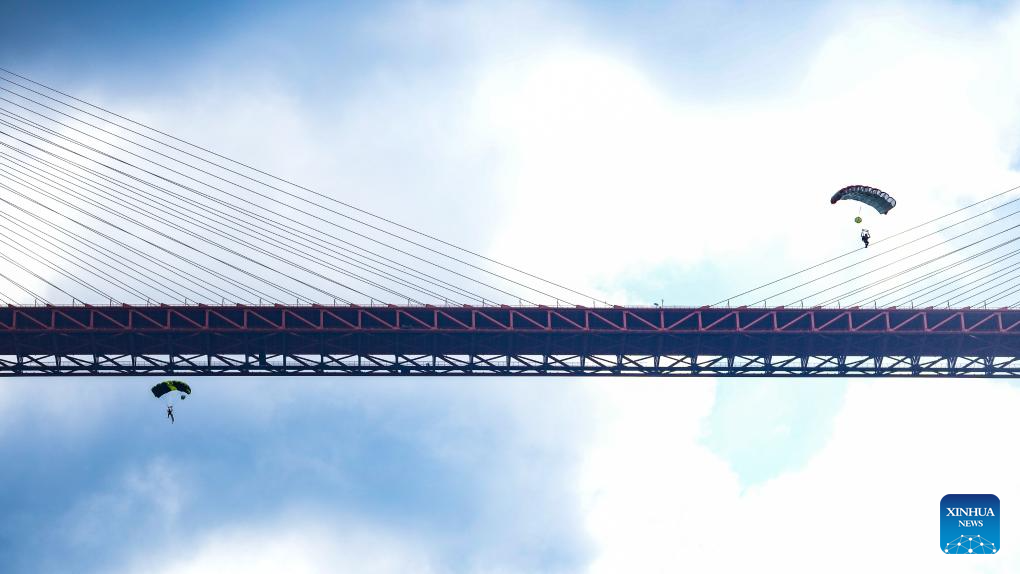 Sky divers take part in the 2024 International High Bridge Extreme Sports Invitational Tournament in Liupanshui, southwest China's Guizhou Province, Sept. 22, 2024. (Xinhua/Tao Liang)