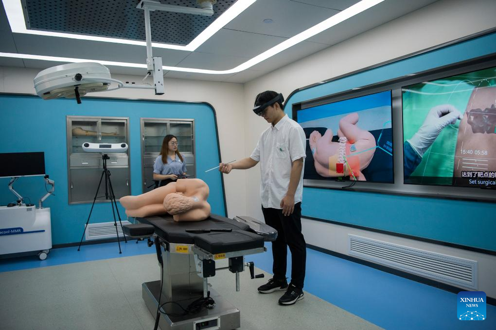 A staff member of Reacool Medical Technology Co., Ltd. demonstrates a digital surgery aided platform at a simulated operating room in the Vision Valley of China in Wuhu City, east China's Anhui Province, Sept. 20, 2024.