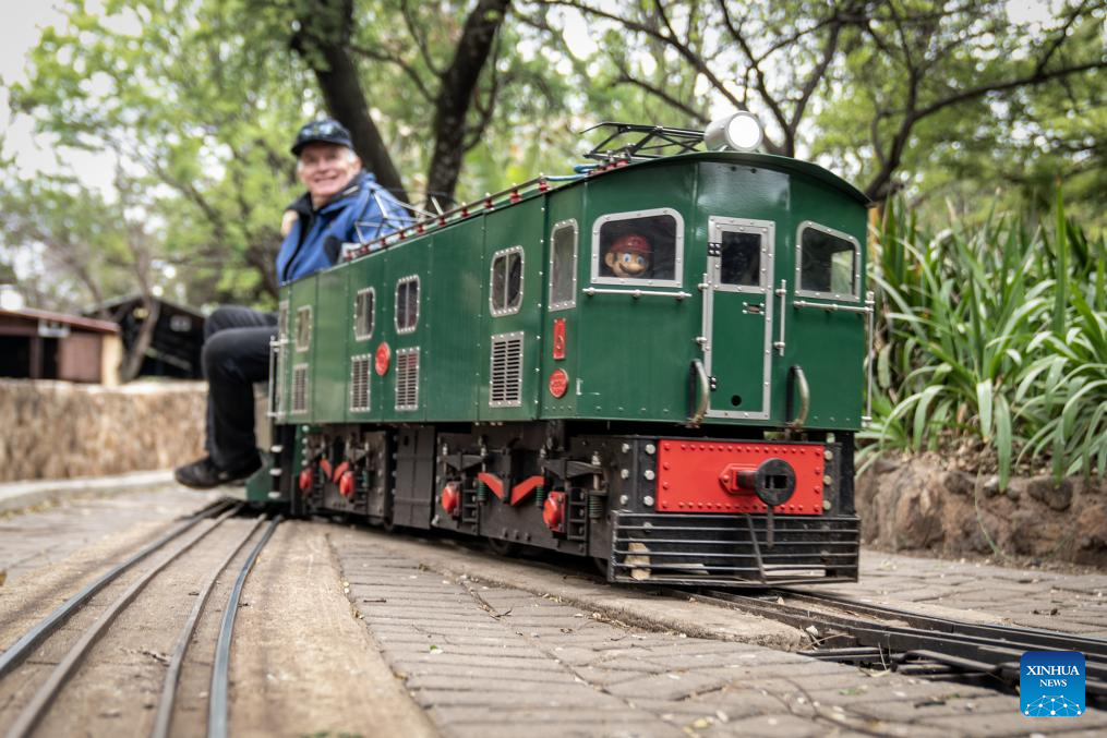 A model train enthusiast operates a miniature train at the Model Engineering Fair held in Centurion of Gauteng, South Africa, Sept. 22, 2024.