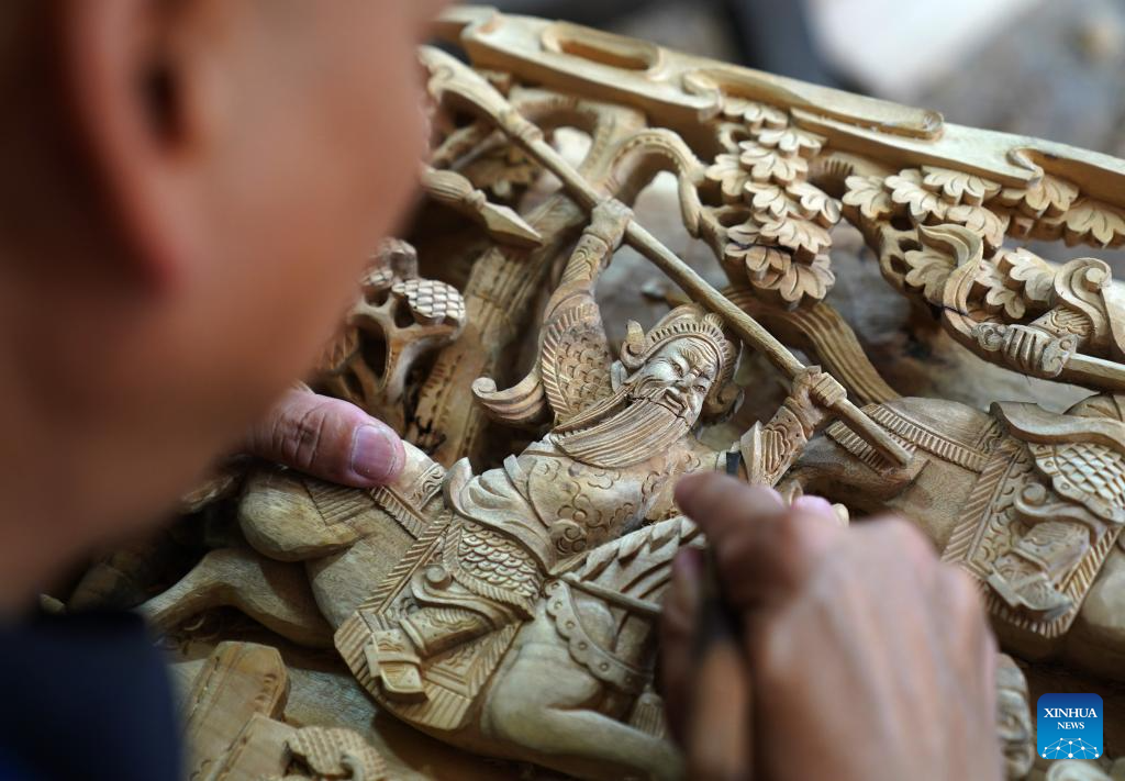 Yu Youhong, an inheritor of the craft, is also committed to protecting and restoring ancient buildings in his hometown. Currently, Yu and his apprentices have restored the wood carvings of more than 100 ancient buildings built in the Ming and Qing dynasties (1368-1911). (Xinhua/Wan Xiang)