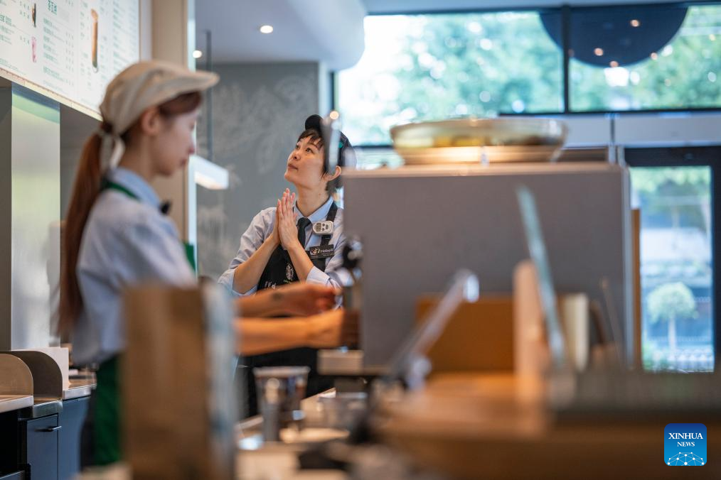 Chen Yuanyuan (R) works at a sign language Starbucks in Wuhan, central China's Hubei Province, Sept. 22, 2024.